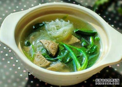 豬肝菠菜湯 食材:菠菜500g、豬肝150g、油適量、雞粉適量、豬骨湯適量 做法:1.食材:菠菜和豬肝。 2.買回來的豬肝要先用清水浸泡2小時左右,期間更換清水幾次。 3.烹飪前,切片,再用清水浸泡30分鐘,然后再洗凈。 4.將豬肝放入預先煲好的豬骨湯里,煲30分鐘。 5.將菠菜放入鍋中灼燙一下,去草酸。 6.豬肝煲好,放入適量的雞粉。 7.倒入適量的粟米油。 8.放入菠菜。 9.蓋鍋蓋,大火煮滾,即可關火。 10.盛入湯碗中,上桌后就可美美享用啦