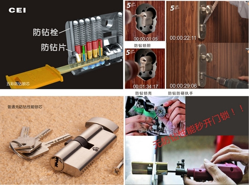 鑒于鎖芯鎖芯殼銅的材料做成的特征,如果不做保護(hù)措施的話,鉆頭一鉆,鎖芯立即被鉆穿,所就開了,鎖芯的加防鉆栓防鉆片是非常錯(cuò)誤的。在鎖芯的鎖釘前端的關(guān)鍵位置植入由錳鋼做成的防鉆栓、防鉆片可以有效的防止鎖芯被鉆。任何不做防鉆栓處理的防盜鎖芯都是不及格的,更沒資格談B級(jí)超B級(jí)鎖芯的問題。