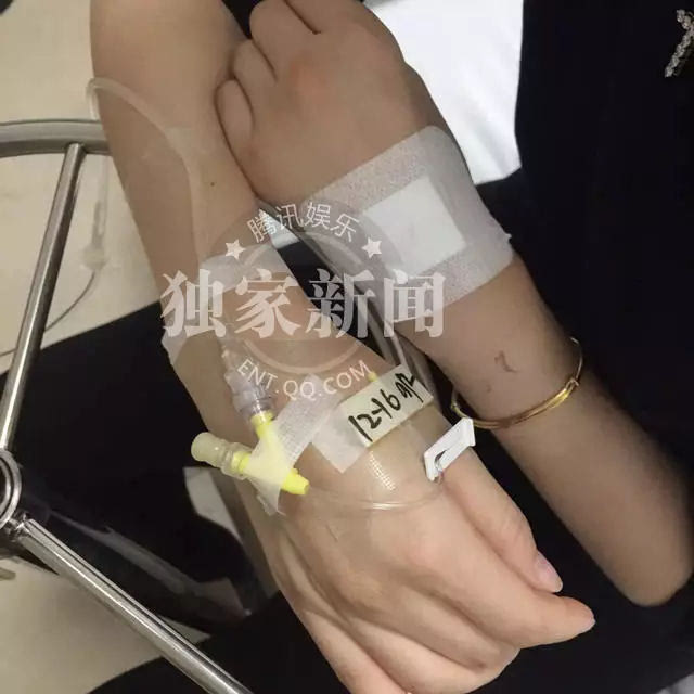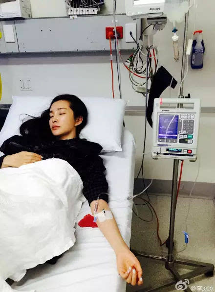照片中,李冰冰躺在床上面容憔悴,已經燒至39.7度,左手還插著輸液管,白色的床單上留有明顯的血跡。手上已經出現淤青,看上去很虛弱,總之,心疼的小編是不要不要的。