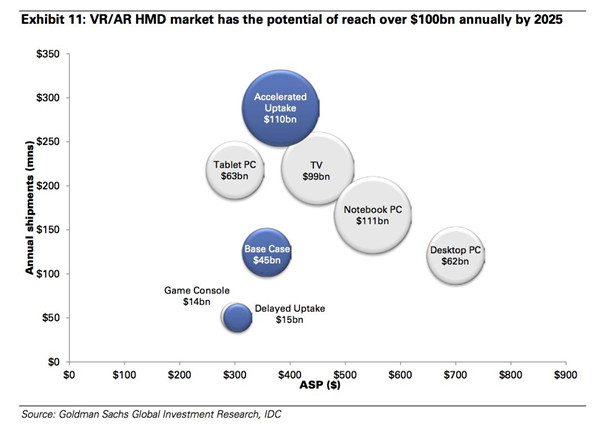 而國內(nèi)的發(fā)展勢頭也絲毫落下,甚至是更為火熱,傳統(tǒng)硬件公司、互聯(lián)網(wǎng)巨頭與創(chuàng)業(yè)者們爭相入局。當前國內(nèi)已有諸如暴風魔鏡、蟻視科技、靈境VR(樂視投資)、樂相科技、驍龍科技、拓視科技(魅族投資)、經(jīng)偉度的Three Glasses、眼界的EMAX、UCglasses等等公司?;ヂ?lián)網(wǎng)與硬件公司諸如騰訊、小米、魅族、樂視等亦是紛紛通過資本入局。 然而這僅僅只是VR火熱的冰山一角。據(jù)火焰工廠CEO婁池介紹:僅僅就在中國,就一下子涌現(xiàn)出200多家各種VR創(chuàng)業(yè)公司,市場上現(xiàn)在能看到100多個眼鏡盒子,每星期至少2個VR產(chǎn)品發(fā)布。要是算上北美和歐洲的項目,加起來至少有400多個創(chuàng)業(yè)公司在廝殺。 那么是什么力量促使VR這一成熟程度遠未達到當前智能手機成熟高度,需要攻克的技術難點更是不勝枚數(shù)的產(chǎn)業(yè)在此時呈現(xiàn)出如此狂熱之勢?或許從以下幾個方面可以解釋。 二、十年內(nèi)千億級年營收規(guī)模,虛擬現(xiàn)實技術具備極大的發(fā)展?jié)摿?/span> 虛擬現(xiàn)實技術因其廣泛的應用范圍、交互模式的變革、沉浸式使用體驗、被許多人認為是下一個大發(fā)展的風口所在。眾多機構也預測,未來VR產(chǎn)業(yè)市場規(guī)模有望在十年到十五年內(nèi)突破萬億大關,硬件設備、娛樂內(nèi)容、跨界服務三大投資機會將不斷顯現(xiàn)。 在此前高盛發(fā)布的一項長達58頁,詳細討論虛擬現(xiàn)實(VR)和增強現(xiàn)實(AR)產(chǎn)業(yè)的未來發(fā)展狀況的研究報告中預測:VR和AR擁有巨大的潛能,它可能會成為下一個大型計算平臺,不論是VR還是AR都有能力發(fā)展成年營收數(shù)百億美元的產(chǎn)業(yè),它可能會像電腦的出現(xiàn)一樣影響深遠。報告顯示,到2025年AR和VR硬件軟件營收將達800億美元,如果它們迅速跳出小眾市場走向大眾,年營收最多可以達到1820億美元。作為對比,平板電腦市場營收預計為630億美元,臺式機預計為620億美元,游戲機預計為150億美元。