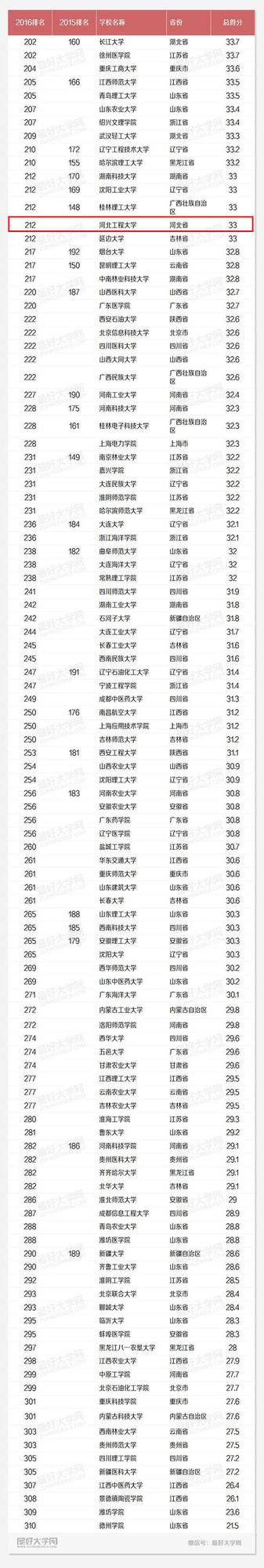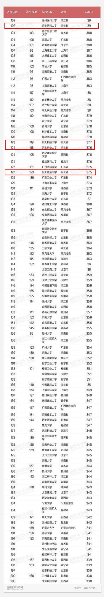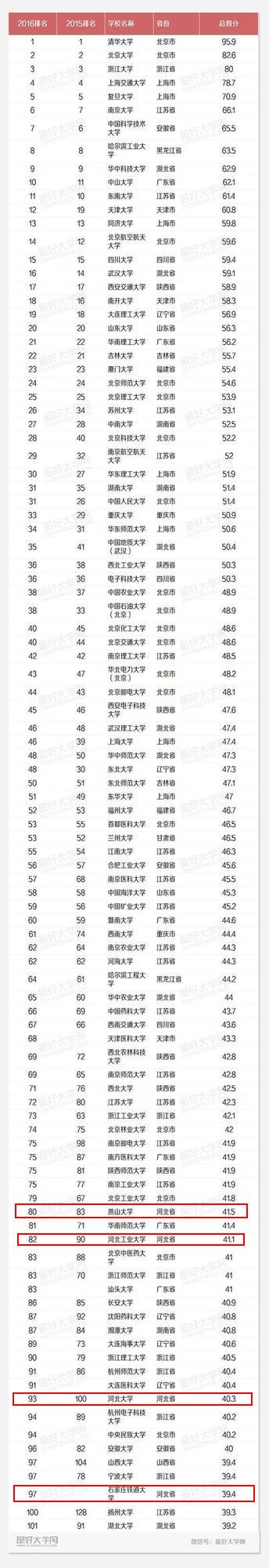 2016中國最好大學(xué)排名發(fā)布,河北共有9所高校上榜,分別為燕山大學(xué)、河北工業(yè)大學(xué)、河北大學(xué)、石家莊鐵道大學(xué)、河北醫(yī)科大學(xué)、河北科技大學(xué)、河北農(nóng)業(yè)大學(xué)、河北師范大學(xué)、河北