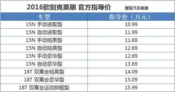2016款別克英朗 日前正式公布售價,新車推出6款15N以及3款18T共計9款車型, 售價區(qū)間10.99-15.99萬 ,與在售版本保持一致。2016款英朗 在動力、配置方面進行了升級 。 2016款別克英朗全系