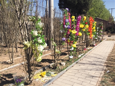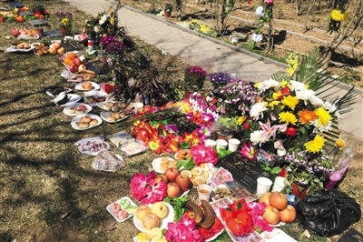 昨日,北京長(zhǎng)青園,骨灰深埋區(qū),擺滿祭品。