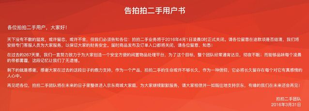 現(xiàn)在想想,騰訊圍繞拍拍網(wǎng),做來(lái)做去也只是布局。 去年雙十一前夕,京東集團(tuán)發(fā)布關(guān)于停止拍拍網(wǎng)C2C平臺(tái)服務(wù)的公告,稱(chēng)將于今年年底停止提供拍拍網(wǎng)的服務(wù),并在明年4月份徹底關(guān)