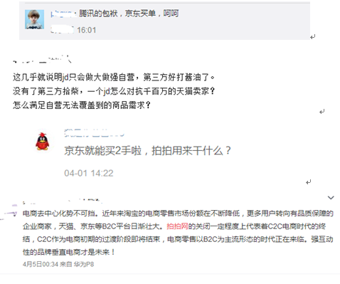 到這里,拍拍網(wǎng)這攤“爛泥”,騰訊算是甩給了京東。在此之前,拍拍網(wǎng)及QQ網(wǎng)購(gòu)長(zhǎng)期都是虧損狀態(tài)。據(jù)港股公告,截至2013年9月20日,二者虧損7100萬(wàn)元,2012年虧損2000萬(wàn)元,2011年虧損16200萬(wàn)元。京東接手拍拍后,除了獲得一定的資源和流量入口,還增大了電商領(lǐng)域的市場(chǎng)份額,并實(shí)現(xiàn)了上市利益最大化。 但是,在這樣狀態(tài)下的拍拍網(wǎng),被普遍認(rèn)為是騰訊的雞肋產(chǎn)品,且前途不被看好。而事實(shí)也確實(shí)如此——拍拍網(wǎng)并沒(méi)有幫助京東拓寬電商疆土,反而拖垮了京東整體業(yè)績(jī)。 京東難逃騰訊雞肋資產(chǎn)后遺癥,拍拍網(wǎng)最終無(wú)奈退場(chǎng) 接手拍拍網(wǎng)不久后京東上市。而其上市后的第一步戰(zhàn)略動(dòng)作,便是宣布成立拍拍網(wǎng)子公司(2015年3月),大力進(jìn)軍C2C市場(chǎng)。外界認(rèn)為京東重塑拍拍是意在對(duì)標(biāo)淘寶。 隨后,鑒于二手市場(chǎng)正火爆,京東也很快在10月上線了拍拍二手,試圖借此打通京東訂單系統(tǒng)——用戶可“一鍵轉(zhuǎn)賣(mài)”在京東買(mǎi)到的商品。不過(guò),無(wú)奈二手市場(chǎng)玩家眾多——淘寶的閑魚(yú)、58同城的轉(zhuǎn)轉(zhuǎn)等。拍拍二手的出現(xiàn)對(duì)整個(gè)在線二手交易市場(chǎng)而言,也只是蜻蜓點(diǎn)水,沒(méi)有掀起大風(fēng)浪。 好景不長(zhǎng),京東將拍拍幾經(jīng)折騰,還是沒(méi)能完成騰訊交給的這個(gè)“重任”——2015年雙十一當(dāng)天,京東宣布關(guān)閉了拍拍網(wǎng)。理由是C2C模式的電子商務(wù)在中國(guó)目前的商業(yè)環(huán)境中監(jiān)管難度較大,無(wú)法有效杜絕假冒偽劣商品。 在這個(gè)義正言辭的說(shuō)法背后,其實(shí)更多的是京東無(wú)意漸漸邊緣化的C2C 業(yè)務(wù),專(zhuān)心保持自身優(yōu)勢(shì)與天貓抗衡。同時(shí),京東在雙十一當(dāng)天對(duì)C2C模式的否定,也被認(rèn)為是映射了淘寶主營(yíng)的C2C模式。 接手不到兩年,拍拍網(wǎng)不僅沒(méi)有為京東的B2C業(yè)務(wù)帶來(lái)協(xié)同效益,反而拖累了京東交易總額,甚至在關(guān)閉后也沒(méi)有帶來(lái)好影響——京東財(cái)報(bào)顯示,2015年京東虧損94億元,而虧損的原因主要之一就是拍拍網(wǎng)停止運(yùn)營(yíng)帶來(lái)的相關(guān)商譽(yù)和無(wú)形資產(chǎn)減值。 對(duì)此,我們也可以來(lái)看看網(wǎng)友們的看法:
