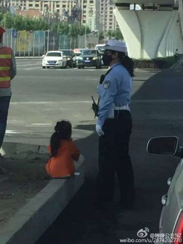 這張照片的作者(@婷婷公主NZ) 在微博中這樣說(shuō)道:今天看見(jiàn)的最感人的一幕:她是警察,也是媽媽。大禮拜女兒坐在路邊陪著媽媽站崗!我想,如果孩子有人帶,她絕不會(huì)讓自己的孩子