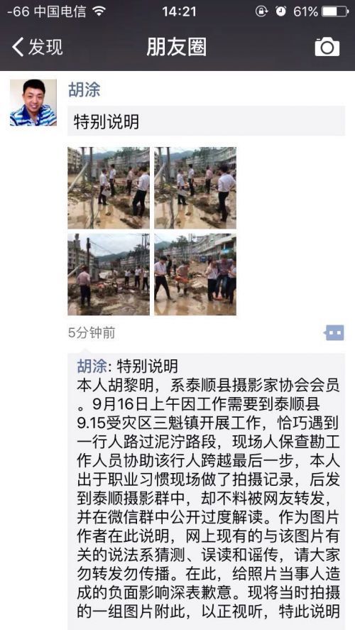 拍攝者發(fā)布“特別說明” 胡黎明是這張圖片的拍攝者,他也是保險(xiǎn)公司的工作人員。他告訴記者,他當(dāng)時(shí)拍下了這張照片,并隨手發(fā)到了一個(gè)攝影群里,結(jié)果沒想到最后被傳成這樣。 今天下午在他的朋友圈發(fā)布了“特別說明”: 本人胡黎明,系泰順縣攝影家協(xié)會(huì)會(huì)員。9月16日上午因工作需要到泰順縣9.15受災(zāi)區(qū)三魁鎮(zhèn)開展工作,恰巧遇到一行人路過泥濘路段,現(xiàn)場(chǎng)人保查勘工作人員協(xié)助該行人跨越最后一步,本人出于職業(yè)習(xí)慣現(xiàn)場(chǎng)做了拍攝記錄,后發(fā)到泰順攝影群中,卻不料被網(wǎng)友轉(zhuǎn)發(fā),并在微信群中公開過度解讀。作為圖片作者在此說明,網(wǎng)上現(xiàn)有的與該圖片有關(guān)的說法系猜測(cè)、誤讀和謠傳,請(qǐng)大家勿轉(zhuǎn)發(fā)勿傳播。在此,給照片當(dāng)事人造成的負(fù)面影響深表歉意?,F(xiàn)將當(dāng)時(shí)拍攝的一組圖片附此,以正視聽,特此說明。 胡黎明說,當(dāng)時(shí)他跟同事一起去處理保險(xiǎn)理賠的事務(wù),地點(diǎn)就在三魁鎮(zhèn)薛宅村,“我當(dāng)時(shí)拍這個(gè)是想體現(xiàn)災(zāi)情面前人與人之間相互救助,沒想到最后完全變了味道,這是被人過度解讀了。” (責(zé)任編輯:admin) |