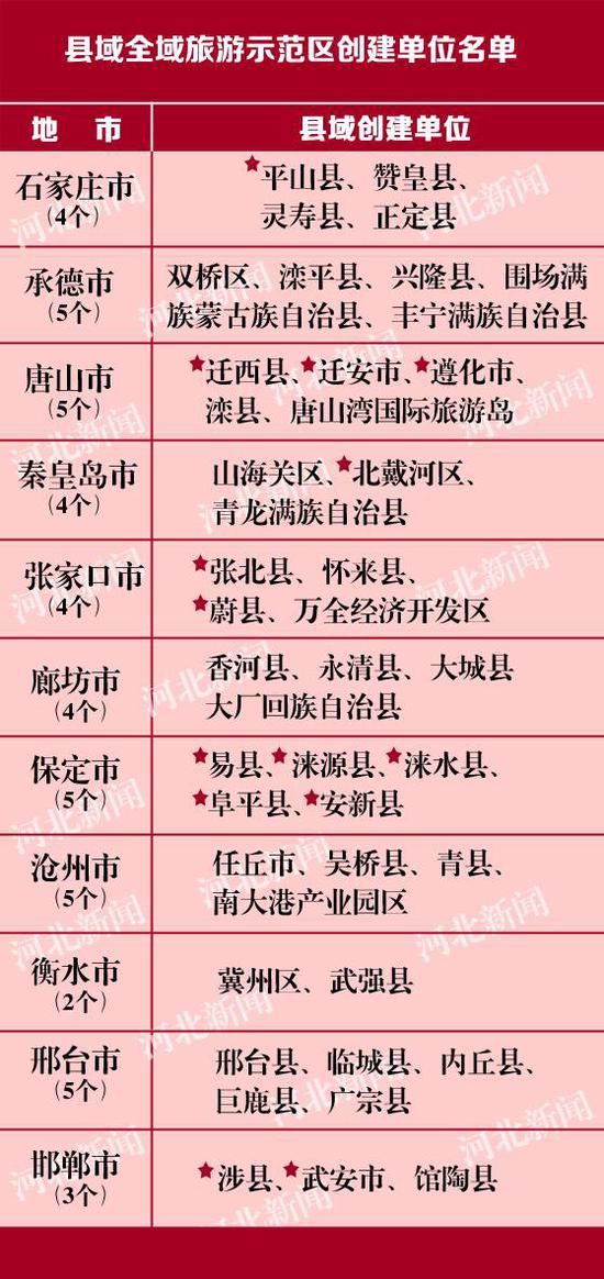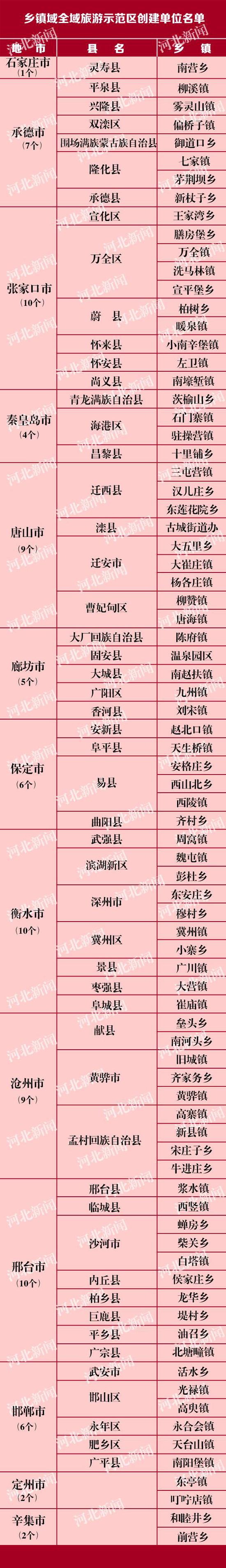 最新好消息!河北省全域旅游示范區(qū)創(chuàng)建最新全名單公布啦。除了入選國(guó)家全域旅游示范區(qū)創(chuàng)建名單的17個(gè)市、縣外,我省還將打造50個(gè)左右縣域全域旅游示范區(qū)、80個(gè)左右鄉(xiāng)鎮(zhèn)域全域旅