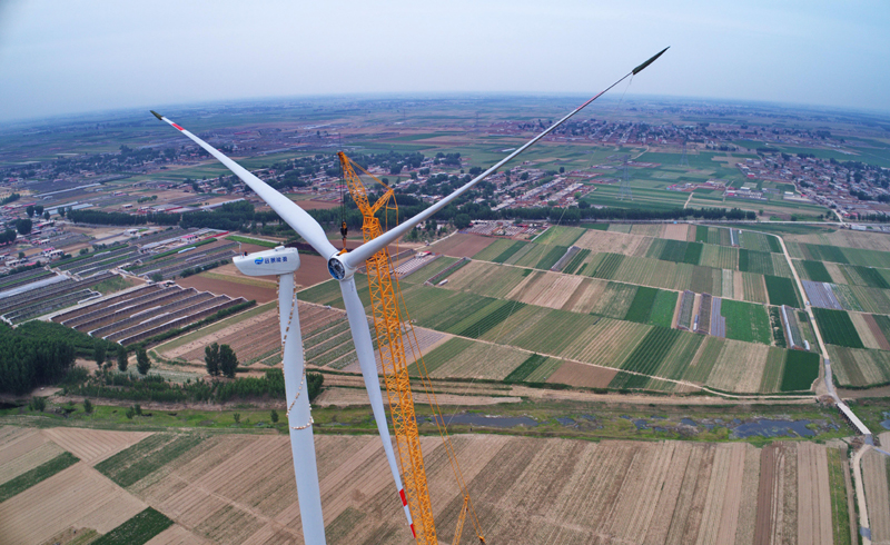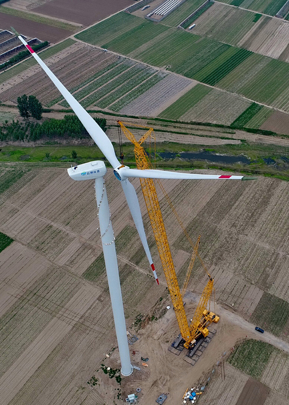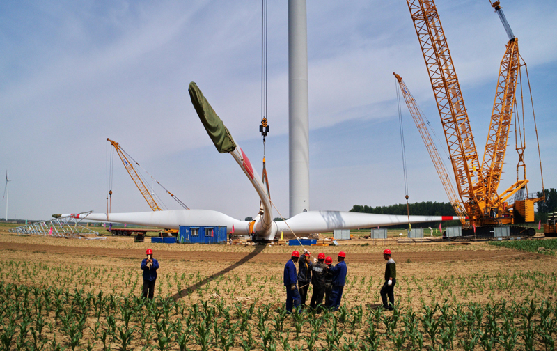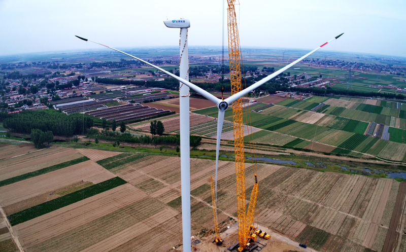 6月5日,施工人員在昌黎縣灤河口風(fēng)電項(xiàng)目一期工程工地吊裝2.2兆瓦風(fēng)力發(fā)電機(jī)組。 近日,河北省昌黎縣灤河口風(fēng)電項(xiàng)目一期工程開始正式吊裝風(fēng)機(jī)。據(jù)介紹,該項(xiàng)目計(jì)劃總投資16.5億元,規(guī)劃容量199.5兆瓦,分二期完成。一期工程設(shè)計(jì)容量為49.5兆瓦,安裝單機(jī)輪轂高度120米,容量為2.2兆瓦的23臺(tái)風(fēng)力發(fā)電機(jī)組,預(yù)計(jì)今年7月底竣工并網(wǎng)投運(yùn)。二期工程裝機(jī)容量為150兆瓦,安裝64臺(tái)單機(jī)容量為2.2兆瓦和4臺(tái)2.3兆瓦的風(fēng)力發(fā)電機(jī)組。整個(gè)項(xiàng)目竣工投運(yùn)后,年發(fā)電量可達(dá)4億千瓦時(shí),年利稅約2600萬元。
