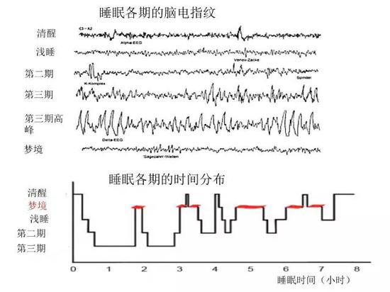一夜睡眠的時相和分期 上: 睡眠分期的腦電指紋。睡前閉眼但清醒時腦電是8-12 赫茲的阿爾法波。進入第一期淺睡后腦電波變慢(西塔波)。睡眠加深到第二期時有偶爾的高波和紡錘波。深睡(第三期)以高幅度,低頻率的慢波腦電為主。夢境 時腦電與清醒時相似。下:睡眠各期在一夜間的循環(huán)。第一個小時中從淺睡,第二期到第三期,之后出現(xiàn)夢境。然后再進入第二期第三期。這個循環(huán)在一夜中出現(xiàn)幾 次。