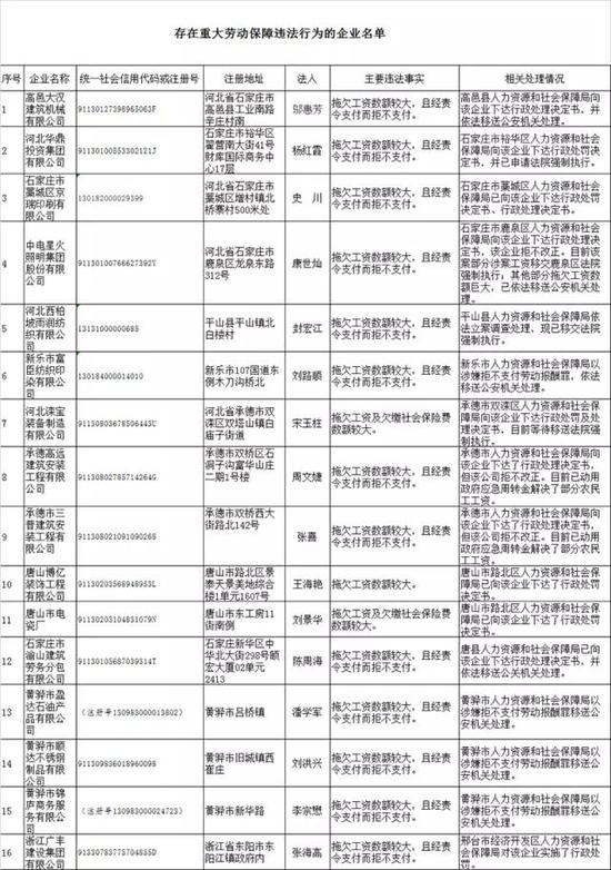 6月23日,河北省人社廳公布16家存在重大勞動(dòng)保障違法行為的企業(yè)名單,以及50家被評(píng)定為全省勞動(dòng)保障守法誠(chéng)信優(yōu)秀等級(jí)企業(yè)的名單。另外,石家莊國(guó)稅局日前曝光21戶存在稅收違法行為的企業(yè)??炜纯炊加姓l(shuí)? 16家存在重大勞動(dòng)保障違法行為的企業(yè) 按照《重大勞動(dòng)保障違法行為社會(huì)公布辦法》(人力資源和社會(huì)保障部令第29號(hào))和《河北省重大勞動(dòng)保障違法行為社會(huì)公布實(shí)施辦法》(冀人社規(guī)〔2016〕7號(hào))有關(guān)規(guī)定,河北省人社廳將存在重大勞動(dòng)保障違法行為的16家企業(yè)有關(guān)情況予以公布。 據(jù)了解,這些企業(yè)存在拖欠工資及欠繳社會(huì)保險(xiǎn)費(fèi)數(shù)額較大,或拖欠工資數(shù)額較大且經(jīng)責(zé)令支付而拒不支付等違法事實(shí),被進(jìn)行了相關(guān)處理。 16家存在重大勞動(dòng)保障違法行為的企業(yè)名單、違法事實(shí)及處理情況: ![]() 50家勞動(dòng)保障守法誠(chéng)信優(yōu)秀等級(jí)企業(yè)名單 根據(jù)人力資源和社會(huì)保障部《企業(yè)勞動(dòng)保障守法誠(chéng)信等級(jí)評(píng)價(jià)辦法》和《河北省企業(yè)勞動(dòng)保障守法誠(chéng)信管理辦法》有關(guān)規(guī)定,經(jīng)對(duì)企業(yè)遵守勞動(dòng)保障法律、法規(guī)和規(guī)章情況進(jìn)行審核并組織專家評(píng)定,北國(guó)商城股份有限公司等50家企業(yè)被評(píng)定為全省勞動(dòng)保障守法誠(chéng)信優(yōu)秀等級(jí)企業(yè)。 這些企業(yè)在沒(méi)有勞動(dòng)者舉報(bào)投訴的情況下,人力資源和社會(huì)保障部門3年內(nèi)不再對(duì)其實(shí)施日常巡查、書面審查、專項(xiàng)檢查等勞動(dòng)保障監(jiān)察執(zhí)法檢查,并享有優(yōu)先推薦與勞動(dòng)保障工作有關(guān)的評(píng)優(yōu)資格。 50家企業(yè)名單 北國(guó)商城股份有限公司 石家莊君樂(lè)寶乳業(yè)有限公司 石家莊飛機(jī)工業(yè)有限責(zé)任公司 石家莊一建建設(shè)集團(tuán)有限公司 中國(guó)建設(shè)銀行股份有限公司河北省分行 中鐵六局集團(tuán)石家莊鐵路建設(shè)有限公司 河北華北柴油機(jī)有限責(zé)任公司 承德避暑山莊旅游股份有限公司 中承華宇建設(shè)集團(tuán)有限公司 國(guó)電承德熱電有限公司 承德正和爐料開(kāi)發(fā)有限公司 旗幟嬰兒乳品股份有限公司 張家口中油金鴻天然氣有限公司 河北省煙草公司張家口市公司 河北港口集團(tuán)港口機(jī)械有限公司 中糧華夏長(zhǎng)城葡萄酒有限公司 秦皇島興龍輪轂有限公司 秦皇島驪驊淀粉股份有限公司 首鋼京唐鋼鐵聯(lián)合有限責(zé)任公司 中國(guó)平安財(cái)產(chǎn)保險(xiǎn)股份有限公司唐山中心支公司 國(guó)網(wǎng)冀北電力有限公司唐山供電公司 開(kāi)灤(集團(tuán))有限責(zé)任公司錢家營(yíng)礦業(yè)分公司 唐山亞特專用汽車有限公司 唐山松下產(chǎn)業(yè)機(jī)器有限公司 國(guó)藥集團(tuán)工業(yè)有限公司廊坊分公司 固安信通信號(hào)技術(shù)股份有限公司 維特根(中國(guó))機(jī)械有限公司 河北鋼鐵集團(tuán)淶源有色金屬有限公司 保定樂(lè)凱包裝材料有限公司 保定龍?jiān)措姎庥邢薰?/p> 匯通路橋建設(shè)集團(tuán)有限公司 際華三五四三針織服飾有限公司 滄州市市政工程股份有限公司 大元建業(yè)集團(tuán)股份有限公司 河北滄州東塑集團(tuán)股份有限公司 神華黃驊港務(wù)有限責(zé)任公司 河北深海電器有限公司 河北發(fā)那數(shù)控機(jī)床股份有限公司 河北京凱電氣科技有限公司 河北銀行股份有限公司衡水分行 河北衡豐發(fā)電有限責(zé)任公司 國(guó)網(wǎng)河北省電力公司武邑縣供電分公司 邢臺(tái)邢安礦業(yè)管理服務(wù)有限公司伍仲煤礦 國(guó)網(wǎng)河北省電力公司邢臺(tái)縣供電分公司 鋼諾新材料股份有限公司 邯鄲鋼鐵集團(tuán)有限責(zé)任公司 河北普陽(yáng)鋼鐵有限公司 邯鄲市峰峰鑫寶新材料科技有限公司 邯鄲市趙都黃金珠寶有限公司 定州信譽(yù)樓百貨有限公司 石家莊曝光21戶稅收違法企業(yè) 為落實(shí)《國(guó)務(wù)院關(guān)于建立完善守信聯(lián)合激勵(lì)失信聯(lián)合懲戒制度加快推進(jìn)社會(huì)誠(chéng)信建設(shè)的指導(dǎo)意見(jiàn)》,讓“守信者一路暢通,失信者寸步難行”,日前,石家莊賽晨商貿(mào)有限公司等21戶企業(yè)由于偷稅被石家莊市國(guó)稅局列入稅收違法“黑名單”,按照國(guó)家稅務(wù)總局《重大稅收違法案件信息公布辦法(試行)》,現(xiàn)將這些企業(yè)名稱及違法事實(shí)予以公布,對(duì)其當(dāng)事人實(shí)施聯(lián)合懲戒措施。 21戶稅收違法企業(yè)名單 石家莊賽晨商貿(mào)有限公司,在2010年1月至2012年6月期間,采取偷稅手段,少繳應(yīng)納稅款1535.45萬(wàn)元。 石家莊松林進(jìn)出口有限公司,在2010年1月至2012年6月期間,采取偷稅手段,少繳應(yīng)納稅款1307.68萬(wàn)元。 石家莊飛流商貿(mào)有限公司,在2010年1月至2012年6月期間,采取偷稅手段,少繳應(yīng)納稅款949.86萬(wàn)元。 石家莊恒律通貿(mào)易有限公司,在2010年6月至2012年8月期間,采取偷稅手段,少繳應(yīng)納稅款902.82萬(wàn)元。 石家莊鵬燕進(jìn)出口有限公司