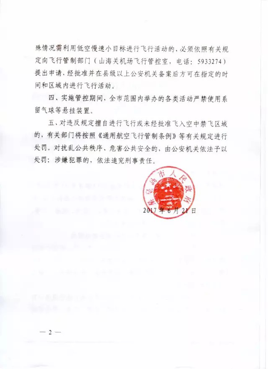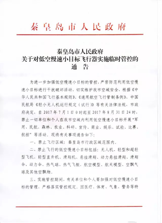 秦皇島市人民政府發(fā)布關(guān)于對低空慢速小目標(biāo)飛行器實(shí)施臨時管控的通告。 從7月1日0時起至8月31日24時,禁止一切單位和個人在秦皇島市空域內(nèi),利用無人機(jī)、熱氣球、航空航天模型、