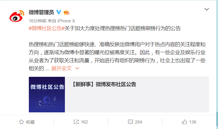 原標(biāo)題:微博公布對(duì)“存在刷榜行為的熱門話題及主持人”處罰措施 關(guān)于加大力度處理熱搜榜熱門話題榜刷榜行為的公告 熱搜榜和熱門話題榜能夠快速、準(zhǔn)確反映出微博用戶對(duì)于熱點(diǎn)內(nèi)容的關(guān)注程度和方向,逐漸成為微博中顯著的曝光位被高度關(guān)注。因此,有一些企業(yè)及娛樂行業(yè)從業(yè)者為了獲取關(guān)注和流量,開始進(jìn)行有組織的刷榜行為,社會(huì)上也出現(xiàn)了一些相關(guān)的互聯(lián)網(wǎng)黑產(chǎn)。 微博為了確保熱搜榜、熱門話題榜的真實(shí)可信,不斷對(duì)產(chǎn)品本身進(jìn)行算法升級(jí)并設(shè)置了以大數(shù)據(jù)識(shí)別為基礎(chǔ)的防刷體系。對(duì)于存在作弊特征的行為,系統(tǒng)都會(huì)實(shí)時(shí)進(jìn)行識(shí)別和攔截。在熱搜榜中,每天約有40%的熱搜詞被系統(tǒng)識(shí)別為流量異常而不能上榜。 微博通過技術(shù)手段構(gòu)筑防御屏障的策略已經(jīng)不能滿足用戶及社會(huì)對(duì)微博的預(yù)期,為了更好的遏制和打擊刷榜行為,微博將加大對(duì)熱搜榜熱門話題榜刷榜行為的處理力度,并對(duì)直接受益者進(jìn)行處罰:對(duì)于存在刷榜行為的熱門話題及主持人,對(duì)于流量異常搜索詞及指向?qū)ο筮M(jìn)行連帶處置。不斷推動(dòng)改善榜單的生態(tài)環(huán)境,傳遞真實(shí)、正能量的信息,有效打擊破壞社區(qū)規(guī)則的不正當(dāng)競(jìng)爭(zhēng)行為。 根據(jù)1月以來的統(tǒng)計(jì)情況,刷榜行為突出的話題和熱搜詞如下: 王樂樂微博 魏千翔 賈冰 初戀男孩馬嘉祺 周筆暢回應(yīng) 奇跡男孩 心機(jī)老公 艷骨 霹靂爸媽 國民老公 嗨看電視 喪燃夫婦 魏千翔姜妍 國民小媳婦姜妍 宋小寶超級(jí)水母 丫蛋與前夫 歡樂喜劇人賈冰 偶像練習(xí)生賴冠霖 前任三王梓 吐槽大會(huì)馬景濤 廈門婚紗攝影工作室 手表復(fù)刻工坊 小宇熱游直播 男神微品會(huì) 娛樂虎少爺 散打哥v5 白菜優(yōu)惠券內(nèi)部分享君 小寶姐姐m 頭腦王者 澳門雷少 #張雪迎光頭##gai 眼妝##孫紅雷向瓜子索賠一個(gè)億##李小璐現(xiàn)身##炫邁舞不停##大勛小斐張若昀##答題一夜暴富##嘉賓不滿評(píng)委黑幕失控發(fā)飆# 處罰措施: 1、以上相關(guān)明星、節(jié)目、事件名稱,3個(gè)月不能再上熱門話題榜和熱搜榜; 2、相關(guān)賬號(hào)3個(gè)月不能主持話題; 微博將以此做法為基礎(chǔ),對(duì)熱搜榜熱門微博榜的刷榜行為進(jìn)行持續(xù)的管制。同時(shí)微博也會(huì)積極推動(dòng)和配合主管部門和公安部門對(duì)其中可能涉及到的違法犯罪行為進(jìn)行調(diào)查取證,希望能夠以法律手段維護(hù)互聯(lián)網(wǎng)環(huán)境的健康清朗 (責(zé)任編輯:admin) |