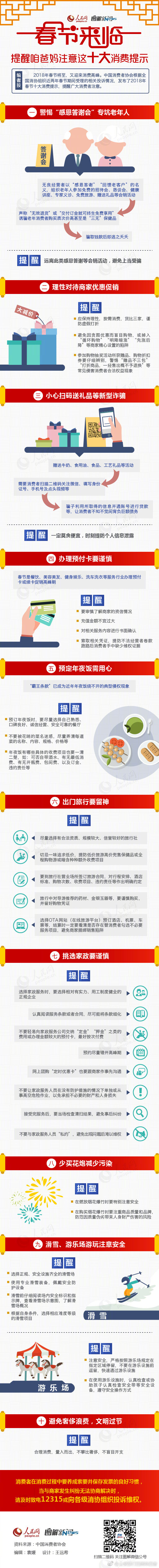 2018年春節(jié)將至,又迎來(lái)消費(fèi)高峰。中國(guó)消費(fèi)者協(xié)會(huì)根據(jù)全國(guó)消協(xié)組織近兩年春節(jié)期間受理的相關(guān)投訴情況,發(fā)布了2018年春節(jié)十大消費(fèi)提示,提醒廣大消費(fèi)者注意。 ![]() |