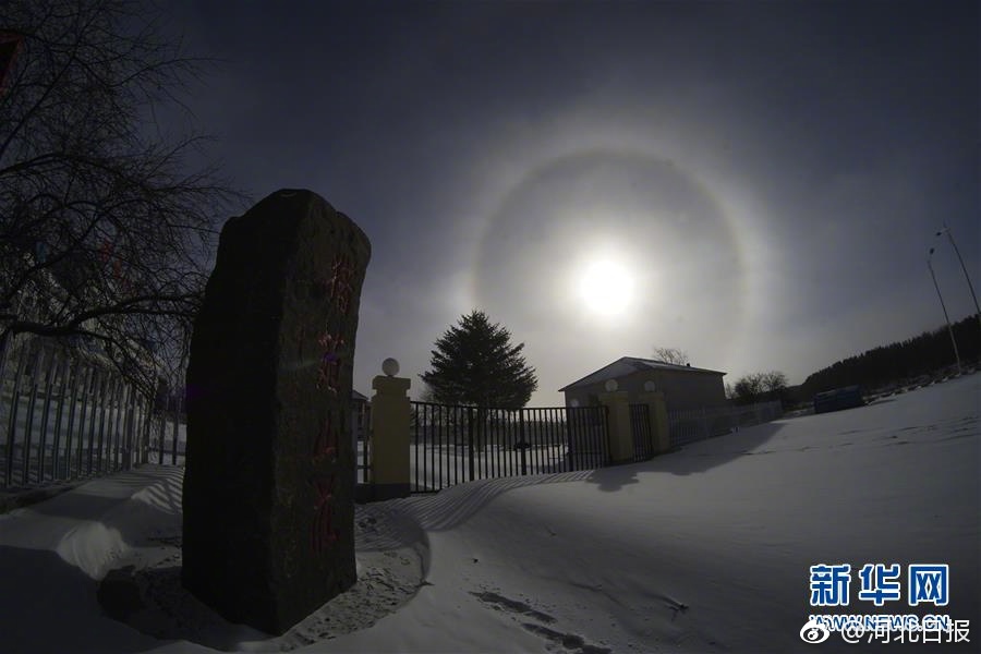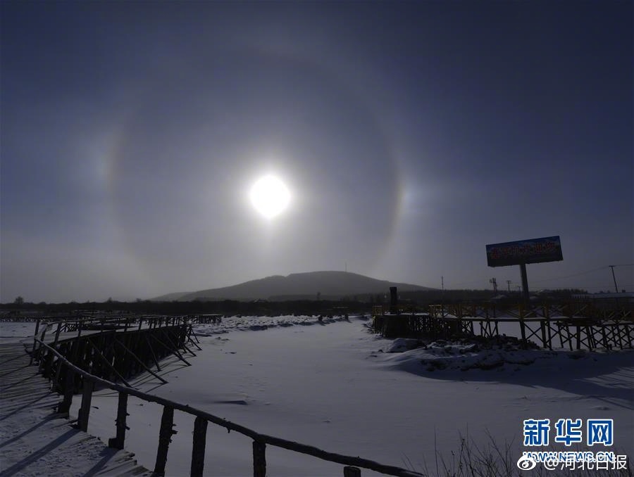 這是1月28日在河北塞罕壩林場拍攝的日暈景觀。日暈,又叫圓虹 ,一種大氣光學(xué)現(xiàn)象,是日光通過卷層云時(shí),受到冰晶的折射或反射而形成的。當(dāng)光線射入卷層云中的冰晶后,經(jīng)過兩次