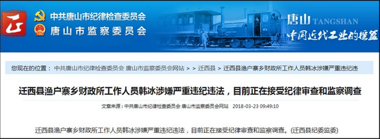 據(jù)唐山市紀委監(jiān)委網(wǎng)站消息, 遷西縣漁戶寨鄉(xiāng)財政所工作人員韓冰涉嫌嚴重違紀違法,目前正在接受紀律審查和監(jiān)察調(diào)查; 路北區(qū)人才市場工作人員王婧涉嫌嚴重違法,目前正在接受
