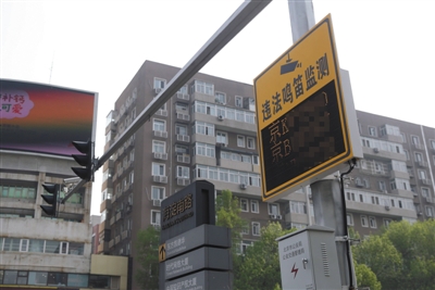 昨日,海淀黃莊路口,新增設的“聲吶電子眼”違法鳴笛抓拍設備。 新京報記者 王貴彬 攝