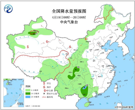 未來(lái)三天具體預(yù)報(bào) 4月19日08時(shí)至20日08時(shí),新疆北部和沿天山地區(qū)的高海拔地區(qū)、青藏高原東部、川西高原西部等地的部分地區(qū)有小雪或雨夾雪,南疆西部山區(qū)、內(nèi)蒙古中東部、黑龍江東南部、西北地區(qū)東部、西藏東部、西南地區(qū)、江漢西部、江南西部、華南西部等地的部分地區(qū)有小到中雨,局地有大雨,上述局部地區(qū)將伴有短時(shí)強(qiáng)降水、雷暴大風(fēng)等強(qiáng)對(duì)流天氣。新疆北部、西北地區(qū)東部、內(nèi)蒙古、華北北部、遼東半島、山東半島等地有4~6級(jí)風(fēng),新疆山口風(fēng)力可達(dá)7~8級(jí);內(nèi)蒙古中西部、甘肅西部、新疆南疆盆地等地有揚(yáng)沙或浮塵天氣,局地有沙塵暴。 4月20日08時(shí)至21日08時(shí),內(nèi)蒙古中東部、黑龍江南部、西北地區(qū)東部、華北中南部、黃淮西部、江漢、江南西部、華南中北部等地的部分地區(qū)有中到大雨,河南北部、湖南西北部、廣西北部局地有暴雨(50~90毫米),上述局部地區(qū)將伴有短時(shí)強(qiáng)降水等強(qiáng)對(duì)流天氣。新疆東部、內(nèi)蒙古、東北地區(qū)中南部等地有4~6級(jí)風(fēng)。 4月21日08時(shí)至22日08時(shí),內(nèi)蒙古東部偏南地區(qū)、華北大部、黃淮中西部、江淮中西部、江漢東部、江南中北部及廣西北部等地的部分地區(qū)有中到大雨,其中,華北中部和廣西北部有暴雨(50~90毫米),上述局部地區(qū)將伴有短時(shí)強(qiáng)降水等強(qiáng)對(duì)流天氣。新疆東部、內(nèi)蒙古中東部等地有4~6級(jí)風(fēng)。 |
