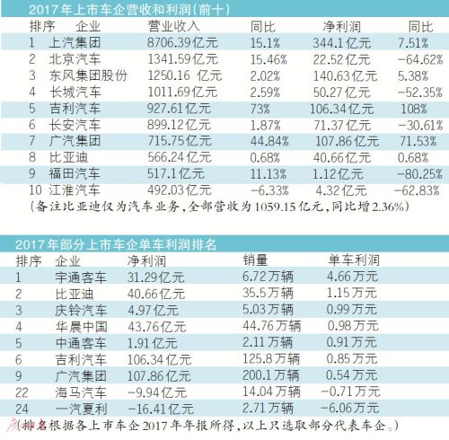 進入五月份,各大上市車企的去年年報全部出爐。市場最關(guān)注的“八卦”來了——中國車企哪個最能賺錢?哪個單車利潤最高?誰看起來賺了不少但其實“外強中干”?記者在24家上市整車企業(yè)的年報中留意到,上汽集團依然是中國車企的“龍頭企業(yè)”,但廣汽集團和吉利集團成為了自主品牌中的“尖子生”,表現(xiàn)耀眼。除此之外,商用車領(lǐng)域賺錢能力讓人“跌破眼鏡”,部分乘用車企業(yè)深陷虧損泥潭。 中國車企盈利能力參差不齊 上汽集團依然是“龍頭” 記者留意到,上汽集團依然是國內(nèi)車企中的“龍頭”企業(yè),2017年,上汽集團在產(chǎn)銷規(guī)模、營收、利潤等幾項“大指標”上蟬聯(lián)寶座,而且營收和銷量也遠超前十車企的總數(shù)。年報顯示,上汽集團以8706.39億元位居國內(nèi)車企營業(yè)收入第一,同比增長15.10%,是國內(nèi)最賺錢的汽車集團,凈利潤為344.1億元,同比增長7.51%,凈利潤率是3.95%。2017年上汽集團營收是位列第二的北汽的6倍之多,且占據(jù)到了整個上市車企營收的一半,第2名到第24名車企的營業(yè)收入相加,總和也才9962.48億元。 不容忽視的是,得益于產(chǎn)品銷量的增長,中國重汽、吉利汽車、廣汽集團等幾家車企的營收增長也非常搶眼。其中吉利汽車2017年營收為927.61億元,同比增長73%,凈利潤為106.34億元,同比增長108%;廣汽集團2017年營收為715.75億元,同比增長44.84%,凈利潤為107.86億元,同比增長71.53%。 廣汽和吉利成為自主品牌“尖子生” 在凈利潤規(guī)模方面,雖然上汽以344.1億元將其他公司遠遠扔在后面。但東風集團股份、廣汽集團和吉利汽車都實現(xiàn)了百億級別的凈利潤。最為突出的是吉利和廣汽,不僅營收增幅喜人,在凈利潤額上也位居前列。廣汽集團以15.07%的凈利潤率成為國內(nèi)汽車行業(yè)整車上市公司中利潤率最高的車企。廣汽七成以上的利潤增幅得益于自主板塊,旗下自主品牌“傳祺”強勢拉動增長,是當之無愧的優(yōu)秀自主品牌的“尖子生”典范。同樣的,吉利更是風頭十足,不談李書福一系列的收購行為,近年吉利在產(chǎn)品、營銷方面的發(fā)力,讓吉利去年利潤同比增長108%至106.34億元,利潤呈爆發(fā)式增長。 反觀此前靠SUV大火的長城汽車,去年由于營銷開支增長、研發(fā)投入擴大和哈弗銷量滑坡,利潤腰斬??梢哉f,論英雄還看今朝。吉利和廣汽等“尖子生”,誰能更持久地向上攀升,將決定誰是更優(yōu)秀的自主企業(yè)代表。 商用車盈利能力上升明顯 商用車領(lǐng)域的盈利能力更不容小覷。在2017年上市車企凈利潤增幅方面,金龍汽車實現(xiàn)了扭虧為盈,達到4.7億元,致使凈利潤同比達到166.64%;中國車企中,凈利潤增幅排名第四也是屬于商用車板塊的中國重汽,凈利潤同比增長114.63%至8.97億元。中國汽車工業(yè)協(xié)會表示,在國家經(jīng)濟“穩(wěn)中有升”、供給側(cè)改革初見成效、基建工程投資不斷增加的宏觀背景下,工程車市場容量持續(xù)擴大,公路貨運穩(wěn)定增長,同時受新版GB1589標準實施、“9.21治超”以及更加嚴格的環(huán)保政策等方面的影響,重卡市場出現(xiàn)了爆發(fā)式增長。中國重汽成為這一市場中較為出色的代表。 不過,國內(nèi)車企盈利能力參差不齊,部分車企陷入虧損的泥沼,主要集中在乘用車板塊。如北汽、長城、江淮、江鈴等幾家因銷量大幅腰斬因素導致利潤同比下滑。較為嚴重的是海馬汽車凈利潤下滑532%至虧損9.94億元;而墊底的一汽夏利因夏利品牌停產(chǎn)被雪藏等因素“跌跌不休”,2017年更是巨虧16.41億元,凈利潤同比下滑1100%。 必須一提的是,在24家上市整車公司里,凈利率最高的桂冠竟是華晨汽車,雖然營業(yè)收入僅為53億元,但凈利潤就達到了43.76億元,凈利潤率為82.5%,幾乎是上汽集團的20倍。不過別驚訝,華晨汽車就是“躺著收錢”的典范,在華晨中國的年報中有這樣一句話“寶馬對集團純利貢獻由2016年的39.98億元增加31.0%至2017年52.38億元”。別替華晨高興,合資品牌的強大也正凸顯華晨自主品牌的孱弱,扣除寶馬貢獻的52.38億元純利潤,囊括在上市公司里的華晨自主業(yè)務上的凈虧損達到了8.62億元,幾乎可以“媲美”海馬。 客車單車利潤“完勝”乘用車 如果要評價一輛車企的產(chǎn)品是否具備強大的競爭力,就要看單車營收和利潤。從去年上市車企的財報來看,有的一輛車凈賺5萬元,有的一輛車虧了6萬元!記者留意到,去年單車營收最高的是客貨車和新能源車。這點并不難理解,一輛客車或一輛重卡的價格不便宜,動輒40萬~50萬元甚至更高。單車利潤排在前十的車企當中,大部分客車和重卡車企。 宇通客車霸占榜首,賣一輛車凈賺4.66萬元。注意,別以為盈利能力高的比亞迪為乘用車“爭光”了,比亞迪是一家成功轉(zhuǎn)型的新能源代表車企,去年拉動單車營收和利潤的恰恰是比亞迪的新能源巴士。如比亞迪在美國交付的K9電動公交車,國內(nèi)售價高達200萬元,出口價格更貴,這就是比亞迪汽車在單車營收和利潤方面與客車企業(yè)和重卡企業(yè)不相上下的原因。 在乘用車企業(yè)中,吉利和廣汽的單車利潤“含金量”都很高。吉利的單車利潤高達8500元,廣汽旗下單車利潤也有5400元,屬于運營非常健康的企業(yè),不僅能賺錢能力,企業(yè)實力也不容小覷。排在榜單底部的也多是乘用車企業(yè),如江淮單車利