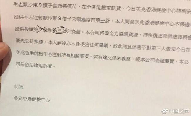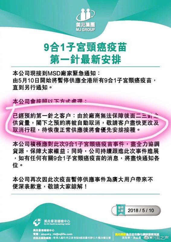 有數(shù)據(jù)顯示,內(nèi)地已經(jīng)有200萬左右的消費者選擇前往香港注射九價宮頸癌疫苗。龐大的市場需求也催生了“內(nèi)地女性赴港打疫苗”的產(chǎn)業(yè)鏈。 九價宮頸癌疫苗一共分3期注射,每期注射一針。但近日香港多家醫(yī)療機(jī)構(gòu)發(fā)布通知稱,已經(jīng)接到默沙東藥廠正式通知,暫停向全港供應(yīng)九價宮頸癌疫苗。不少已經(jīng)打了第一針、第二針的消費者被告知:要么取消,要么延期,無法保證此后一到兩針的供應(yīng)。 然而,記者調(diào)查發(fā)現(xiàn),在“疫苗告急”的通知發(fā)布之后,有香港醫(yī)療機(jī)構(gòu)仍在給部分客戶打“第一針”,明明存貨有限,卻還在服務(wù)新客戶。部分“赴港打疫苗”中介也在招攬新客戶。這究竟是什么原因?消費者的權(quán)益如何維護(hù)?緊張的供需矛盾又是否會滋生“地下市場”? 客戶已交全款,但醫(yī)療機(jī)構(gòu)稱無法保證疫苗有貨 美兆香港體檢中心5月10號發(fā)布通知稱,已經(jīng)預(yù)約第一針的客戶,由于廠商無法保障之后的第二、第三針的供應(yīng)量,客戶的預(yù)約將被自動取消,請客戶盡快更改或取消行程。然而,內(nèi)地的邱女士向中國之聲記者提供了相關(guān)單據(jù)圖片,圖片顯示,在美兆發(fā)布通知之后的5月11號,美兆香港體檢中心還是為邱女士提供了接種“第一針”疫苗的服務(wù),還預(yù)約了第二針的日期,預(yù)約時間為2019年1月。