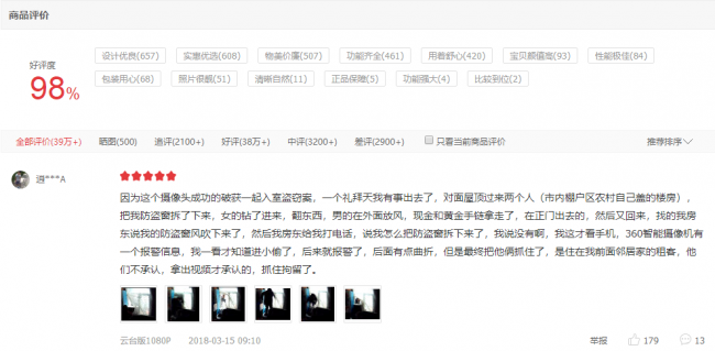 如此看來,360智能攝像機確實起到了家庭安全防護的作用,實際購買一臺用來加強家中安防也未嘗不可。在京東平臺瀏覽360智能攝像機云臺版商品評價時,第一條產(chǎn)品評價格外醒目。該名用戶留言道:因為這個攝像頭成功的破獲一起入室盜竊案。原來,在該用戶不在家之時,一男一女將其家中防盜窗拆下,由窗戶進入到用戶家中,實施盜竊行為。