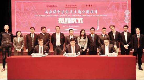 日前,秦皇島山海關(guān)中法文化主題公園項目簽署合作框架協(xié)議。法國Puy Du Fou董事局主席尼古拉斯⋅德⋅威廉,浙江永昌樂地旅游發(fā)展有限公司董事長趙勇強,秦皇島市委書記孟祥偉,市委副書記、市長張瑞書出席簽約儀式。三方經(jīng)過前期溝通,商定在山海關(guān)籌建法國Puy Du Fou主題樂園項目。