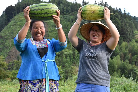 楊寧(右)幫苗族鄉(xiāng)親采摘西瓜。資料圖片 7月12日,從柳州市賣(mài)完西瓜連夜回到村里,已是凌晨3點(diǎn)。在苗寨村主任楊寧的日常生活中,像這樣披星戴月的工作節(jié)奏已成為一種常態(tài)。 楊