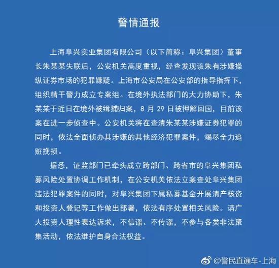因涉操縱“大連電瓷”股價(jià),中國(guó)證監(jiān)會(huì)對(duì)阜興集團(tuán)董事長(zhǎng)朱某某被處以3年證券市場(chǎng)禁入,北京寶袋財(cái)富資產(chǎn)管理有限公司實(shí)際控制人李衛(wèi)衛(wèi)被處以終身證券市場(chǎng)禁入。隨后,朱某某失聯(lián),“阜興系”相關(guān)公司私募產(chǎn)品出現(xiàn)兌付逾期,預(yù)計(jì)金額高達(dá)180億,遭投資者集體維權(quán)。在境外執(zhí)法部門的大力協(xié)助下,涉嫌操縱證券市場(chǎng)并潛逃海外的“阜興系”負(fù)責(zé)人朱某某,近日在境外被緝捕歸案,于今晚21:30左右搭乘航班回到國(guó)內(nèi),目前該案在進(jìn)一步偵查中。