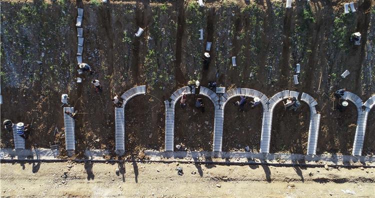 8月29日,京秦高速河北遵化段建設(shè)工地的工人在進(jìn)行邊坡防護(hù)施工(無人機(jī)拍攝)。