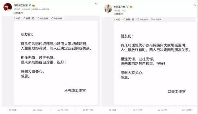 感情本是私人的事情,不管明星們到底是不是和平分手,沒必要廣而告之。但作為公眾人物出于對粉絲負(fù)責(zé)的態(tài)度,通知一聲;分手好聚好散,不撕不罵,也不失為一種成熟的感情處理方式!