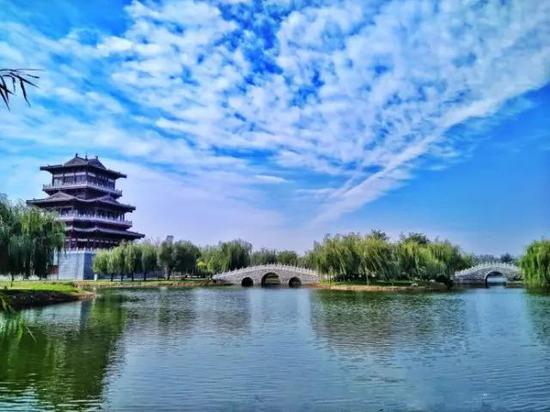 臨漳縣城湖泊蕩漾、風(fēng)景如畫,被外地游客稱贊為“公園中的縣城”。清水進城,臨漳自古與水相依,縣城南北雙渠環(huán)繞。為此,該縣堅持把清水進城作為特色來打造,實施了環(huán)城水系工程。
