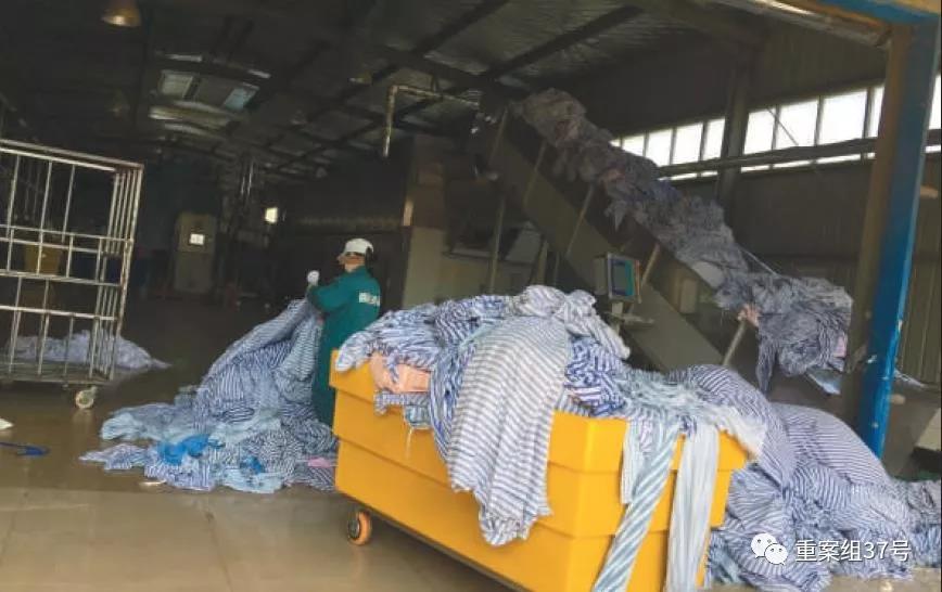11月28日上午,順達洗滌服務(wù)中心內(nèi),一名工人正將從醫(yī)院收來的布草進行拆分,工作人員在拆分時,直接踩在布草堆里工作。 新京報記者尹亞飛攝 紗布、輸液管等醫(yī)療廢物混進洗衣機 11月29日,新京報記者進入順達洗滌服務(wù)中心,成為一名洗滌工。 車間占地近千平米,車間內(nèi)設(shè)有洗衣區(qū)、烘干區(qū)、折疊區(qū),整個車間流水線工作。一些口罩、輸液瓶等醫(yī)療廢物夾雜在布草中,堆放在車間內(nèi)的地面上。 張春蘭是車間洗滌組的組長,她介紹,南昌大學(xué)第一附屬醫(yī)院是洗滌廠的大客戶之一,此外還有江西省人民醫(yī)院、江西省精神病醫(yī)院等多個三甲醫(yī)院。 “工人們以醫(yī)院為單位,分別將布草放入機器清洗,算下來,一天要洗近百噸布草。”洗滌車間負責(zé)人熊玲介紹,洗滌廠上午七點半上班,下午五點半下班,每天都會有醫(yī)院的臟布草送來進行清洗,“整個過程需要員工手動分類,按照顏色把布草分類清洗。” 11月29日上午8時左右,該中心專門運送布草的贛AE4656廂式貨車駛?cè)霃S區(qū),司機打開貨廂,將貨廂內(nèi)雜亂的布草扔到地上。在卸布草的過程中,新京報記者注意到,這批布草印有“南昌大學(xué)第一附屬醫(yī)院”字樣,綠色的手術(shù)服和患者床單混在一起,一些布草帶有大量血跡和糞便。 張春蘭等人在卸貨時,會將布草分揀出來,按照床單、被套、手術(shù)服分為三類。“像手術(shù)服那種綠色的布草要分出來單獨洗,防止染色,”張春蘭說,分揀好了后,就會把布草放在傳送帶上,送到洗衣機里面進行洗滌。 “會根據(jù)科室來分類嗎?”新京報記者在分揀時問張春蘭。 “不用。” “帶血的怎么辦?”記者拿著一張床單遞給張春蘭。 張春蘭捂著嘴,指著身后的地面,“先放這里,一會兒洗。” 記者在分揀過程中,發(fā)現(xiàn)很多布草都有大量血跡及藥物殘留,張春蘭指示都堆放一起,放進小型洗衣機進行清洗。記者注意到,其中包含床單、病號服及醫(yī)生手術(shù)服。 此外,一些帶血的紗布及用過的輸液管等醫(yī)療廢物,有時也被混進洗衣機,跟布草一起混洗。 張春蘭說,醫(yī)用布草都是人工分揀,出現(xiàn)分揀不當(dāng)是經(jīng)常存在的事情,“醫(yī)院那邊要是發(fā)現(xiàn)沒洗干凈,就會退回來重洗。” 新京報記者臥底調(diào)查發(fā)現(xiàn),洗滌廠在洗滌醫(yī)用布草時,并未對布草進行嚴格消毒,而是不分科室進行混洗,也并非專機專洗。在洗滌、甩干、烘干、熨燙折疊四個流程中,所有布草均被雜亂堆放在地面。