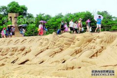 游客欣賞沙雕作品。 本報記者楊寬攝 水與沙,靜與動。 清澈的水歡快靈動,它的故事奔放熱烈;金色的沙靜謐深沉,它的故事源遠流長。 走進金沙灣沙雕大世界,盡是水與沙的壯美奇...